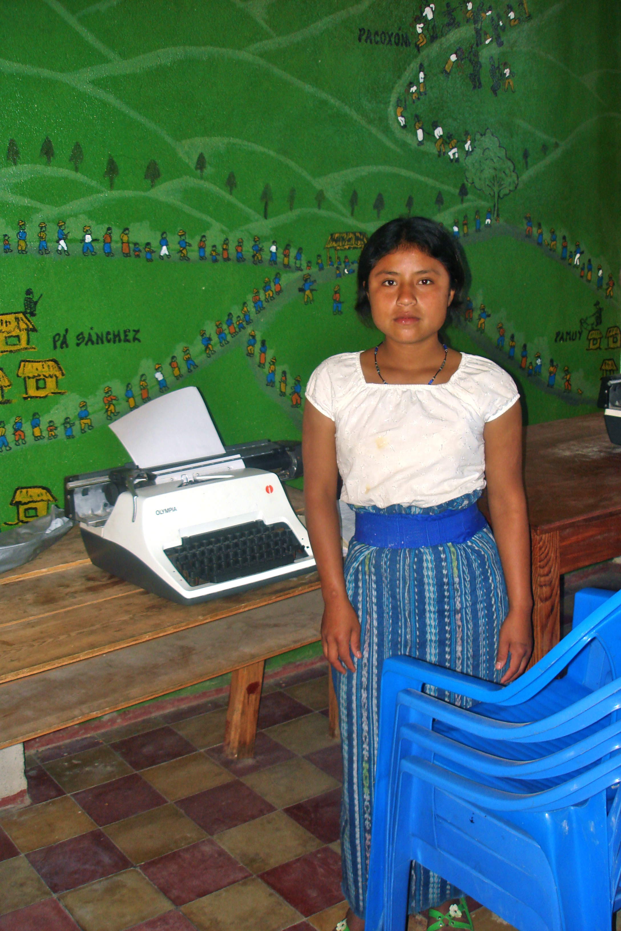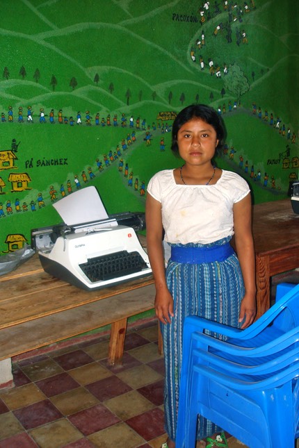 Angelica Osorio Osorio, estudiante de nivel básico, estudia el uso de una maquina de escribir delante de un mural de la masacre de su comunidad. Ahora ella ya se ha graduado del nivel básico.